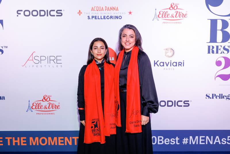 Sara Aqel (left) on the red-carpet, shortly before winning the Middle East & North Africa's Best Female Chef Award 2026, sponsored by Elle & Vire Professionnel