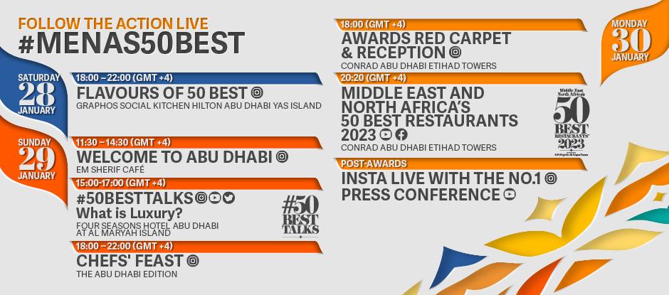 Anticipation is high: Middle East & North Africa’s 50 Best Restaurants, sponsored by S.Pellegrino & Acqua Panna, is returning to Abu Dhabi to announce its second edition on Monday, 30th January from 20:20 local time. Flip through the digital programme for a taste of what’s to come and discover below how you can watch the action unfold live on 50 Best’s digital channels, no matter where you are in the world