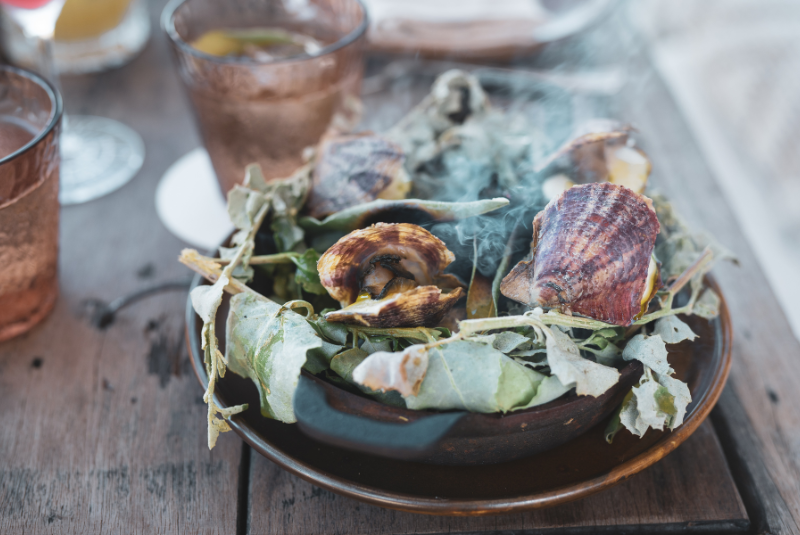 Akoya oysters on hot coals with macadamia nuts and lemon myrtle
