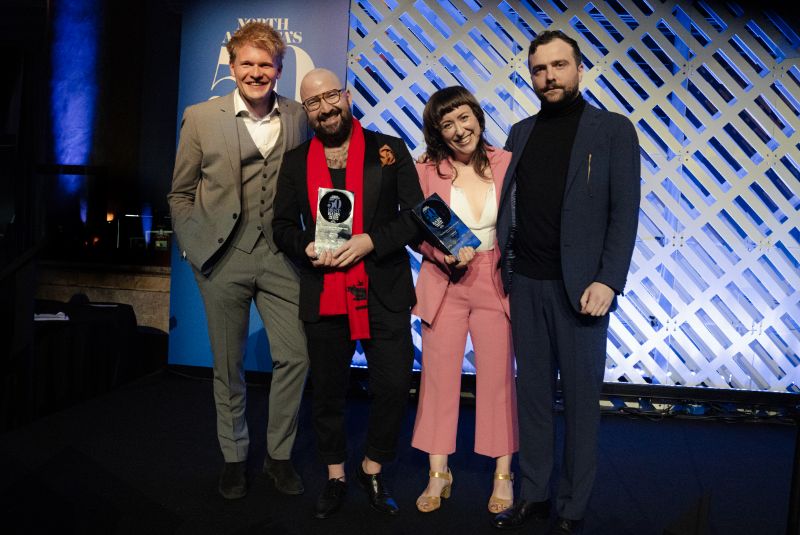 Perrier's PJ Gheysen presents the Attaboy team – Sam Ross, Haley Traub and Rory McIlroy – with The Best Bar in North America 2022 trophy