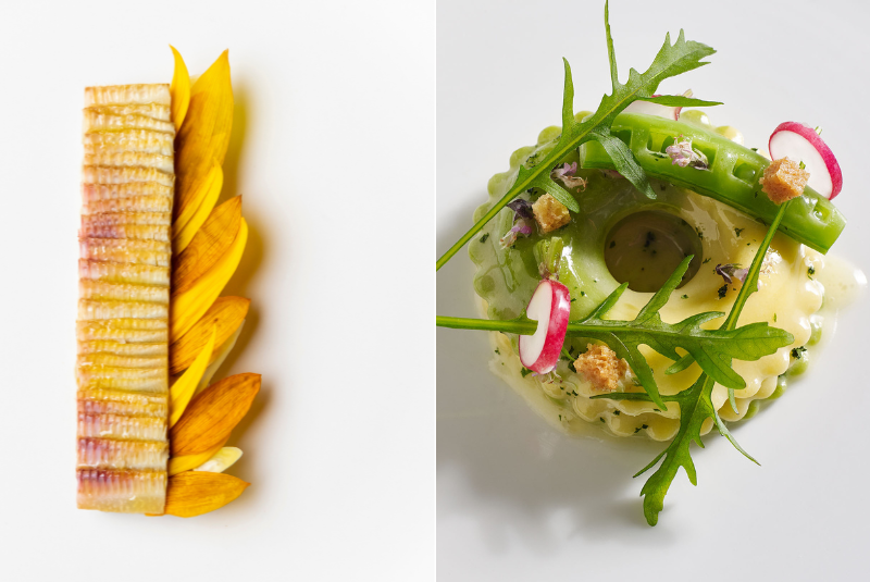 Sunflower with summer beans, epazote and savoury at Eleven Madison Park and ricotta basil anolini at The French Laundry