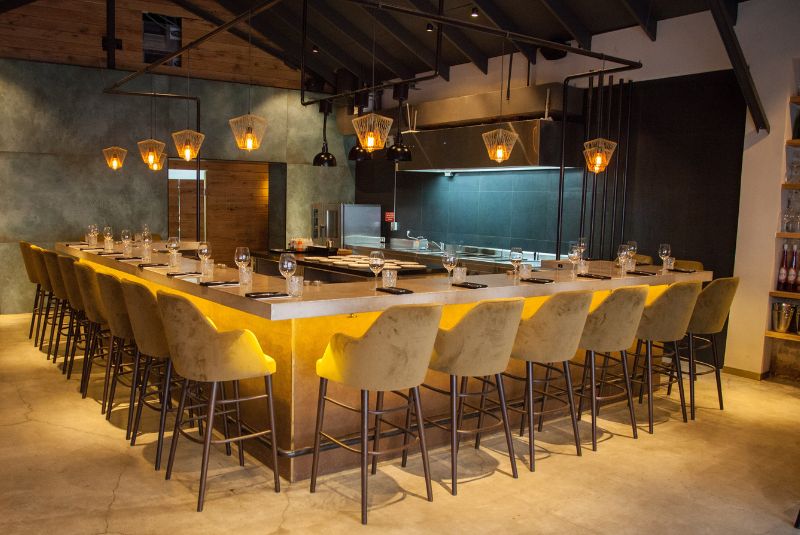 The stage of the night – the open kitchen – is the centre of attention, with seats arranged in a U shape around it. The earthy colours of the walls combine with the triangle-shaped high ceiling and hanging lamps to create a homely atmosphere. With all cutlery and plates in place, the night’s guests are ready to dig in.-1.jpg)