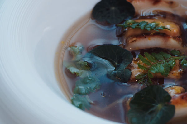“This dish is inspired by my travels in Vietnam. It’s a foie gras dish that we serve as a Vietnamese pho, so it’s a foie gras in a broth with a lot of very fragrant herbs such as mint, coriander, chervil and tarragon. The foie gras is gently poached and what I’m looking for in that dish is the texture of the foie gras, which really melts in your mouth. To play with that, we bring contrast by using Japanese abalone to bring some nice chewiness to the dish – in the good sense of the term. We use some pickled shitake mushroom, which brings another layer of texture and another layer of flavour, so this is a dish that really represents the evolution of our cooking. It’s very simple to look at but very complex in terms of flavour and very interesting and gourmand.”