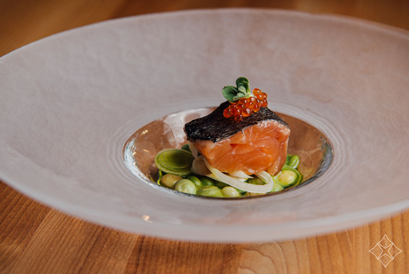 Big Bear – Jackson's dish from Reverence's fall menu, with hand-raised GreenWalk Hatchery California Rainbow Trout, house smoked roe, local leeks, Iacopi Farms cranberry beans and fresh wheat grass broth (image: Cassie Z.)