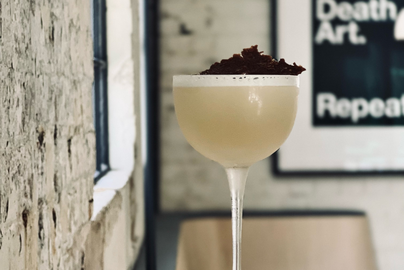 One of Re's signature cocktails, Brickfields, made with tequila blanco, fermented toasted sourdough syrup and lime