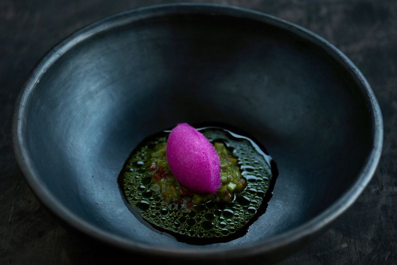 November is early winter in this region and the team is experimenting with the fruits of the season. “Wormwood and watercress – herbs I hadn’t heard of until I moved to Europe – grow in abundance right here, down by the river,” says Sadhu on a walk by a mountain stream. During dinner at Naar, watercress flowers make an appearance atop prickly pear sorbet shavings that sit in a pool of green chilli juice. It’s both wild and mouth-puckeringly delightful.