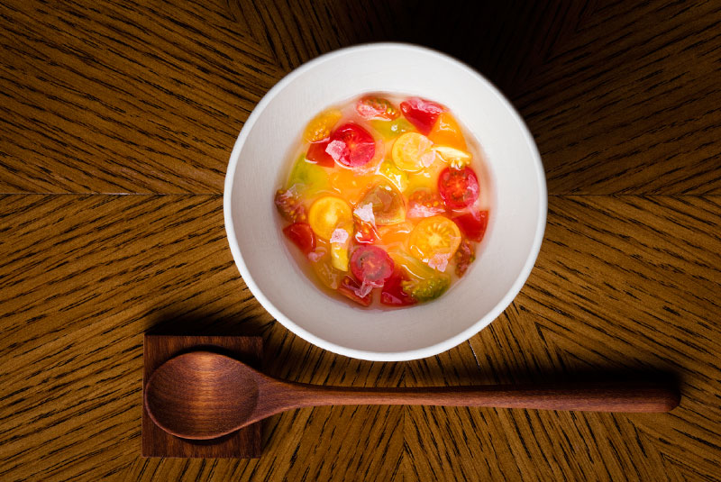 Homemade silken tofu, heirloom tomatoes, salted sakura and virgin almond oil