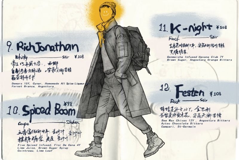 There’s Jonathan, a discerning drinker who doesn’t want to sip the same thing all night. He starts off with something fizzy and moves on to a sour, ending his night with a complex and bitter kick from Festen a blend of Campari, Yunnan beeswax-infused Scotch, elderflower liqueur and chocolate bitters. Then there’s Zoey, who likes snacks with her drinks – a brunch of oatmeal vodka shaken with blueberry marmalade or a TNT tipple with spicy Sichuan beef jerky gin. Xiao Man is a guy who’s in for easy-going drinks: say, a jujube-coffee gin and tonic. And finally the bold-and-chic Kitty, who likes things lush, sipping oolong pisco with bubbles and rose gin sours.