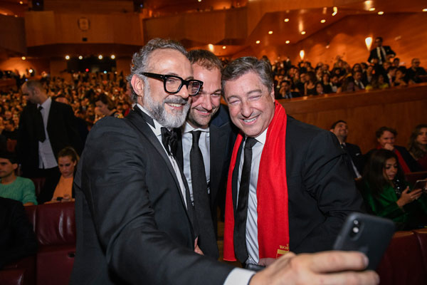 The chef-owners of three previous No.1 restaurants, Massimo Bottura of Osteria Francescana, Daniel Humm of Eleven Madison Park and Joan Roca of El Celler de Can Roca, take a selfie at The World's 50 Best Restaurants 2018