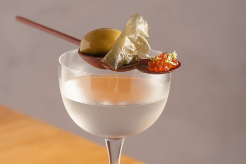 The team applies their sustainable philosophy to the physical menu and dishware too. The menu’s cover, for example, is printed on recycled paper coated with natural rubber and is made by craftswomen from the Amazon village of El Progreso in Tarapoto, San Martín. The Three Sips Martini comes with its own ‘Tres Tiempos’ spoon: designed by León herself, it is made from wood salvaged from trees felled by storms in the Amazon, with three spherical parts holding the aforementioned olive, algae and trout caviar.