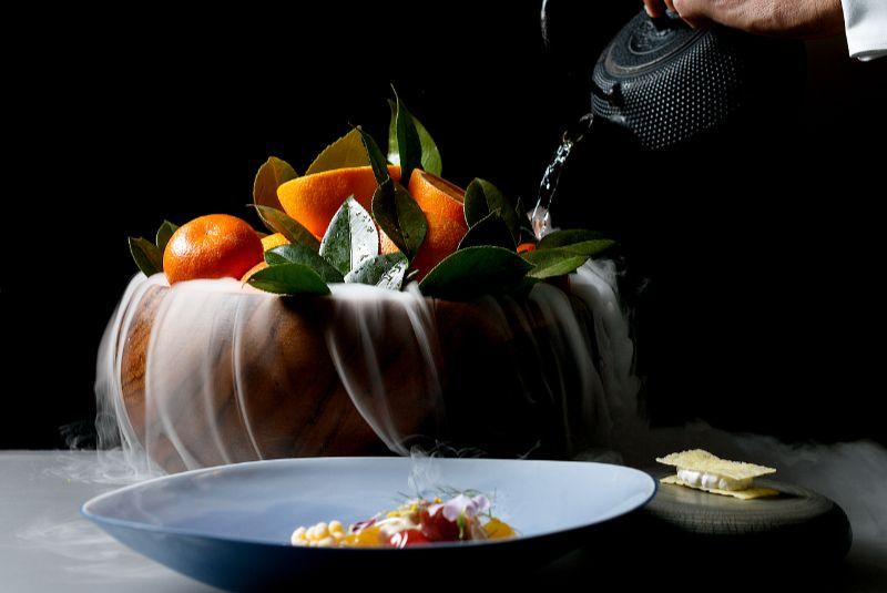 Alinea's gazpacho – scented with tomato, peach and citrus – accompanied by a basket of citrus fruit over dry ice