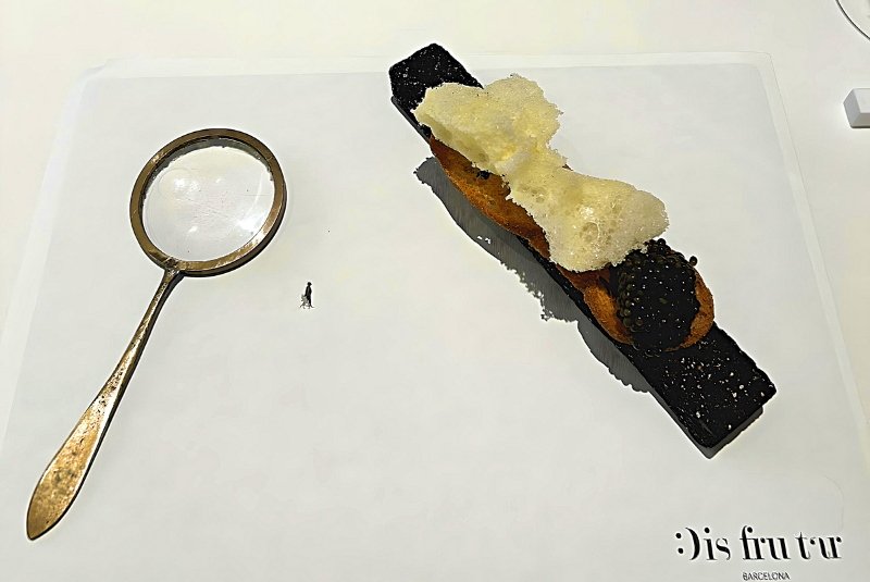 This is bread and butter, but not as you know it. Using an aquarium air pump and a little soya lecithin, butter is transformed into solid fat bubbles, giving dishes the creaminess and flavour of fat, but in a subtle and elegant way. Diners are presented with a magnifying glass to appreciate the technique up close – and appreciate the tiny cut-out of a man on the plate. The smoked butter is set on some crispy bread with a generous heap of caviar.