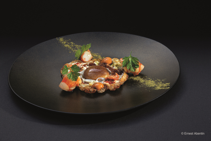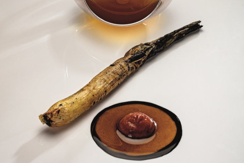 The hi-tech gadgets are in use for this one. To create black vegetables and fruits, the chefs use the OC’OO double boiler. It’s a Korean pressure cooker where the temperature and time is controllable and can be used for long periods of time – which leads to surprising results. To achieve black cauliflower, the team use the ‘aged egg’ programme, which doesn’t just transform the colour, but leads the vegetable to develop interesting balsamic notes and a soft texture, while preserving the original shape of the product. The intensity of the cauliflower is balanced with the velvety and earthy coconut bechamel and a touch of fragrant lime.