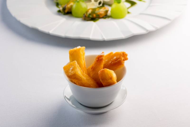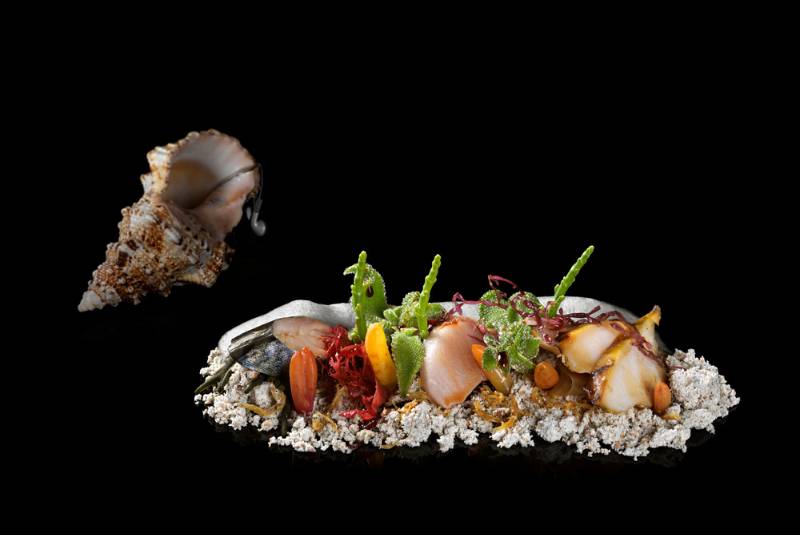 Famously one of the world's most complex desserts, Botrytis Cinerea is made up of 20 different elements and more than 50 stages of preparation. The dish is designed to mirror the flavour profile of wines from Château d'Yquem, the grapes of which have botrytis cinerea (noble rot). This is a type of fungus which shrivels and decays wine grapes, the result being a wine with intensified sweetness and heightened flavour complexity. Among the many elements on the plate, you'll find a roquefort cheese powder, pear balls infused with saffron, aerated saffron, peach wine gum, citrus sorbet, churros stalks, grape paste leaves and a grape sugar bubble and spiral.