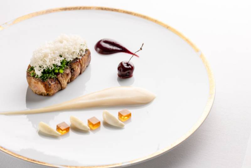 The pairing of fruit with duck liver might not be anything new, but Blumenthal's inspiration for the accompaniments to his dish was anything but conventional. At a symposium, he found out about benzaldehyde, the defining aroma of marzipan and the signature compound in cherries and almonds. Something which had puzzled scientists is that it is undetectable at low levels, but changes if sweetness is present in the mouth. This led to Blumenthal grinding cherry stones and infusing them in warm cherry juice, making a compote with fresh, dried, macerated and sour cherries, adding cubes of amaretto jelly and pioneering a technique (the 'fluid gel') to develop an incredibly smooth and powerful almond puree thickened with gellan. The overall result has an incredibly layered and complex flavour profile.