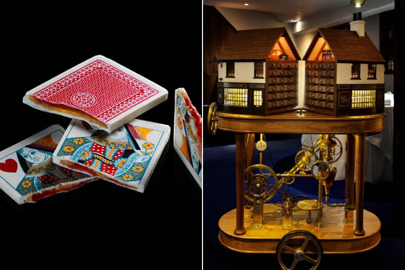 The exciting finale of the experience at The Fat Duck is aptly named – a doll house rendition of the restaurant, with a detailed depiction of Blumenthal's childhood bedroom, is wheeled over. Diners are given a coin to 'spend', and when placed in a slot at the side of the device, the magic ensues. Drawers open and close and eventually, your petits fours are presented to you from a sweetshop scoop-inspired drawer and placed into a signature pink and white striped paper bag. The treats change, but diners might find an incredibly detailed Queen of Hearts edible playing card – the world's thinnest jam tart at 3.5mm thick; a pie caramel with an edible wrapper; a bergamot-flavoured marshmallow with earl grey jelly and a raisin scone biscuit, a nostalgic nod to the classic British snack, a Tunnock's teacake; or Oxchoc, a reinvention of an 1890 Rowntree's confection, boosted with beef consommé.