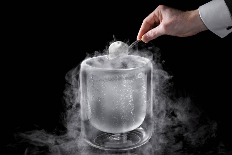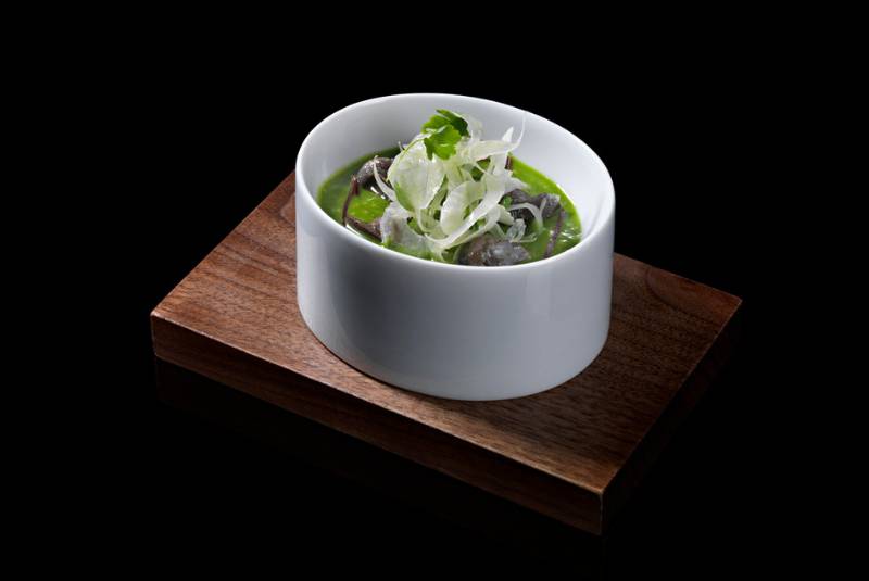 The Fat Duck was the first restaurant to serve a dish using -196°C liquid nitrogen. Theatrically served as a palate cleanser, the Nitro-Poached Aperitifs introduce diners to the menu in a very 'Blumenthal' way. The flavours change with the seasons, but the original Vodka Lime was the first, and is still available today. A pectin base is mixed with malic acid, vodka, egg white and pasteurised lime juice, before being dunked into liquid nitrogen and finished with matcha tea powder and a spritz of lime in the air. The result is a zingy and lighter-than-air bite which disappears in your mouth almost instantly.