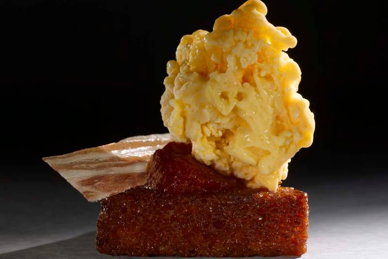 The nitro-scrambled egg and bacon ice cream was one of the defining restaurant dishes of the early 00s. To serve a cooked breakfast... frozen, crack one free range Fat Duck Egg into a pan (not like normal eggs), add a splash of liquid nitrogen, freeze-fry for 30 seconds and serve on a slice of caramelised brioche with tomato and coffee jam, and a slice of maple-cured bacon. Bacon and egg ice cream may have started as an April Fools' Day joke by an ice cream parlour in New York in the 1990s, but it went on to become one of Blumenthal's signatures.