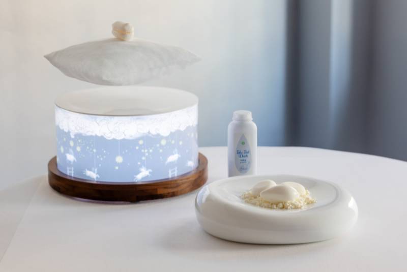 Towards the end of the dining experience, it's time to wind down. Diners don their Blumenthal eye masks and wait patiently for the sounds of a twinkly lullaby. On the table is a floating pillow, and on the pillow are small, malt meringues filled with double milk ice cream. The main dessert hides 12 sleepy flavours and textures, including coconut ice cream, sponge cake, earl grey tea mousse, frozen yoghurt powder, and lavender and coriander notes. It's all finished off with a dusting of edible baby powder. Blumenthal partnered with master perfumer Christophe Laudamiel to discover the aromas that make up baby powder, and how this could be translated to something edible, with vanilla, milk, tonka bean, lavender, coriander and orange blossom.