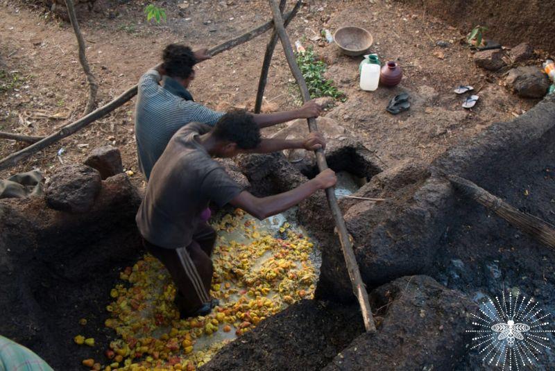 Workers crushing cashew fruit with their feet (Image: Hansel Vaz)