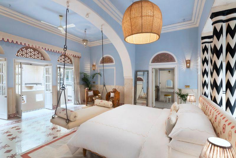 This hotel is a boutique jewel in Jaipur's flourishing hotel scene set in the centre of Johri Bazaar, the pink city's historic jewellery market. Inside the restored 19th-century haveli the gemstone theme continues with five suites curated by New York-based designer Naina Shah, each named after a different jewel. Choose Manek (ruby) to be swathed in shades of dusty pink, Neelam (sapphire) with its signature hanging loveseat in shades of pale blue or the crown jewel: the top-floor Moti (pearl) suite with a dressing room, living room and private verandah.