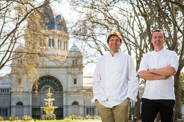 Aussie chefs Ben Shewry of Attica and Dan Hunter of Brae outside the Royal Exhibition Building