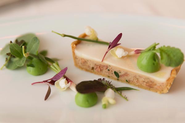 Springbok tataki and tartare, chicken liver and foie gras parfait, rhubarb, lavender and truffled asparagus at La Colombe