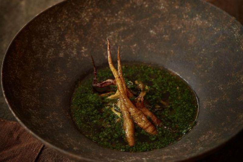A clever spin on Peking duck pancakes, the Peking Peas course achieves depth and umami with a tabletop robata grill