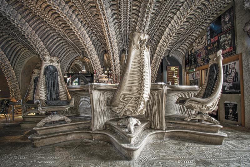 For design that gets down to the bare bones, and we mean literally, head to the bar inside the museum of Swiss surrealist H.R. Giger. If you don't know the name, Giger's the artist behind the nightmare-inducing xenomorph in Ridley Scott's Alien. That same biomechanical aesthetic shapes this womb-like drinking cavern: a spinal column arches across the ceiling and stool backrests are crowned with pelvic bones and flanked by skulls. It's possibly the only place where a drink is scarier than the hangover.