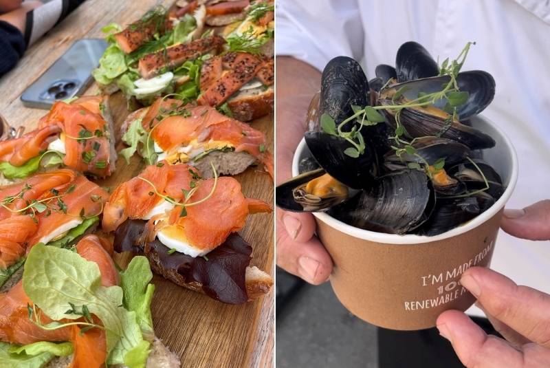 Smoked salmon on sourdough, and fresh mussels from the Smaker fra Øyriket group in Hitra