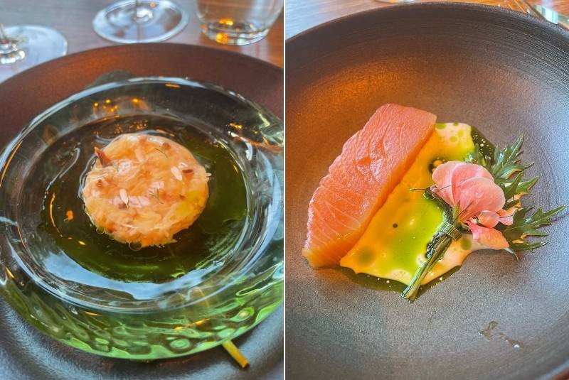 Bjerkan's crab with elderflower and fig oil, and cured smoked salmon with a flower bouquet and jus of horseradish and cream