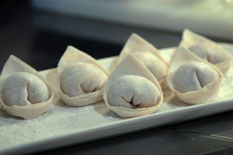 After wrapping, the wontons are placed on a plate lightly dusted with flour to prevent sticking