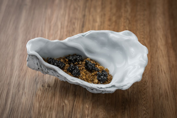 Working with bespoke ceramics company Red Shed Studio Jam, Gilmore undertook new challenges in his cuisine, including what he defined ‘an oyster intervention’. Always inspired by and passionate about textures, Gilmore created his idea of the perfect oyster texture in the form of a silky oyster cream and a crackling made from the frill, topped with caviar and served in a handcrafted ceramic oyster shell.