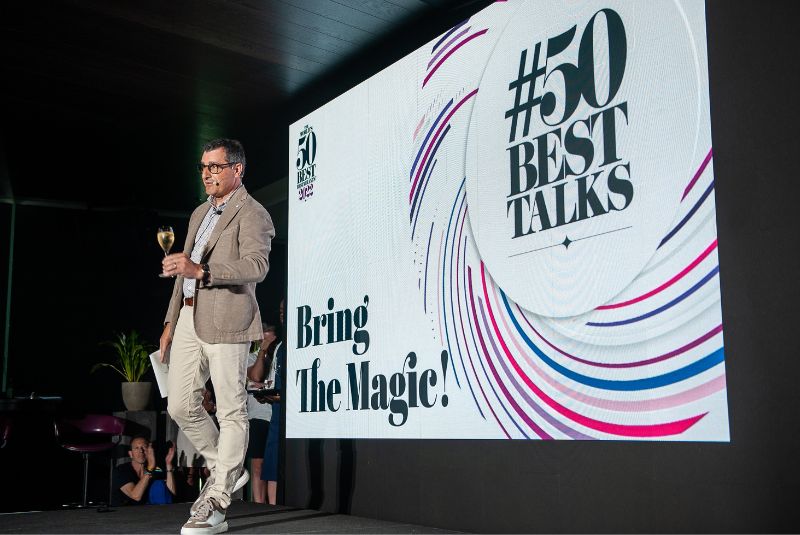 At #50BestTalks: Bring the Magic, Roca conducted a wine tasting from stage