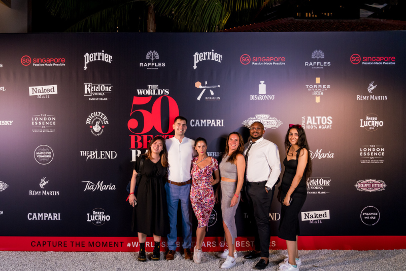 The three scholarship finalists pose with The Blend team at The World's 50 Best Bars 2023 in Singapore