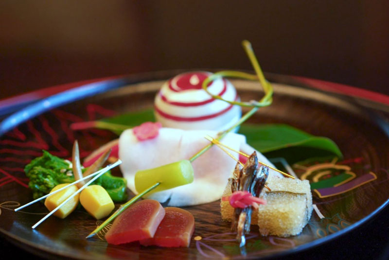 One such tradition is the whole notion of kaiseki, a structured and formal dining philosophy that seeks to provide balance and lightness, focusing on texture and temperature as much as pronounced flavours. The word ‘kaiseki’ actually refers to clutching a stone to one’s stomach to stave off hunger. “A Zen monk embraced a stone during his self-discipline training and that stone helped him bear the hunger of fasting,” explains Murata, who is one of kaiseki’s most accomplished proponents. “That is the origin of kaiseki, which later came to mean a light meal but now can refer to a full-course dinner.”